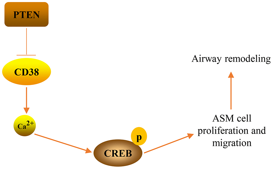 In conclusion, the findings of our study demonstrate that PTEN restricts airway remodeling that occurs in asthma through the downregulation of CD38-mediated Ca2+/CREB signaling. These data provided a detailed molecular mechanism for PTEN in the regulation of airway remodeling of asthma, and highlighted the key role of the PTEN/CD38/Ca2+/CREB signaling axis in the molecular pathogenesis of asthma. Therefore, details of this study provide novel molecular means, which can be exploited to develop improved therapeutic strategies for treating asthma.