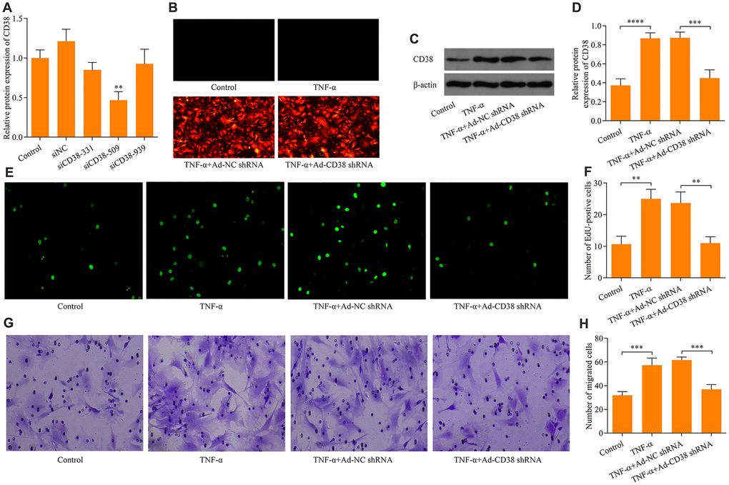 To investigate the precise effect of CD38 on the regulation of TNF-α-induced proliferation and migration of ASM cells, we performed experiments examining the effects of the loss-of-function of CD38. Three siRNAs targeting CD38 were designed and their knockdown efficacy was determined using RT-qPCR. The results demonstrated that siCD38-509 more efficiently knocked down expression of CD38 than the other two CD38-targeted siRNAs (Figure 2A). Therefore, siCD38-509 was used to design CD38 shRNA sequences. The designed CD38 shRNA was subcloned into adenovirus vectors to produce recombinant adenovirus expressing CD38 shRNA (Ad-CD38 shRNA). Recombinant adenovirus was used to infect ASM cells and infection efficiency was determined by observing the RFP fluorescence of the adenovirus vector (Figure 2B). Western blot analysis confirmed that infection of Ad-CD38 shRNA markedly decreased the protein expression of CD38 in ASM cells (Figure 2C, 2D). Notably, knockdown of CD38 inhibited TNF-α-induced proliferation of ASM cells (Figure 2E, 2F). Moreover, knockdown of CD38 significantly blocked TNF-α-induced ASM cell migration (Figure 2G, 2H). Collectively, these data suggest that CD38 knockdown restricts TNF-α-induced proliferation and migration of ASM cells in vitro.