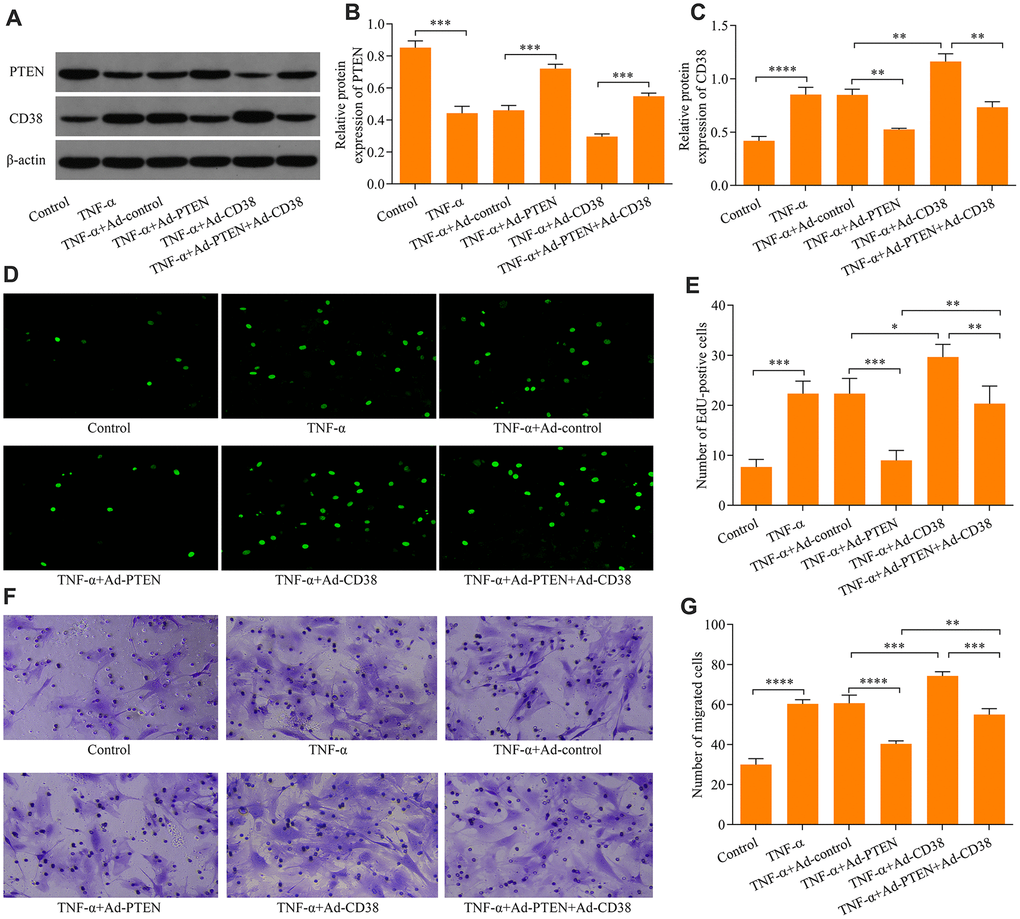 To determine the regulatory role of PTEN on CD38 expression, we assessed the effects of PTEN gain-of-function. ASM infection with Ad-PTEN resulted in significant increases of PTEN protein expression (Figure 3A, 3B). Moreover, PTEN overexpression markedly downregulated the CD38 expression induced by TNF-α stimulation in ASM cells (Figure 3A–3C). Notably, PTEN overexpression markedly impeded TNF-α-induced ASM cell proliferation (Figure 3D, 3E) and migration (Figure 3F, 3G). By contrast, CD38 overexpression exacerbated TNF-α-induced ASM cell proliferation and migration, and reversed the suppressive effect of PTEN overexpression on TNF-α-induced ASM cell proliferation and migration (Figure 3D–3G). Overall, these findings indicate that PTEN overexpression suppresses TNF-α-induced ASM cell proliferation and migration via the downregulation of CD38.