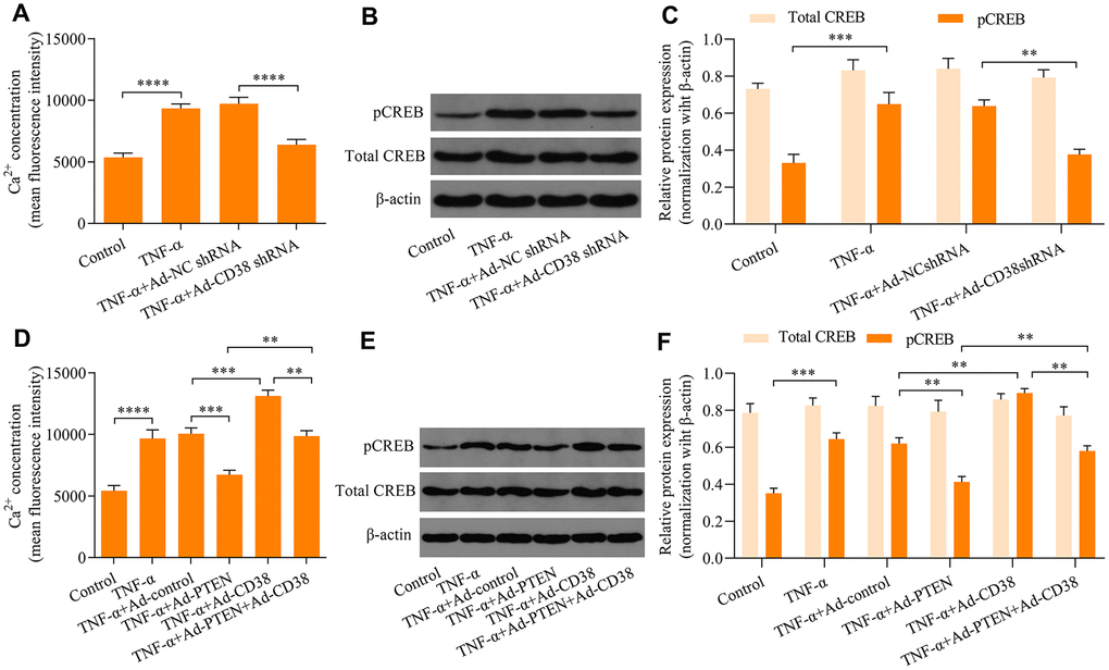 To further explore the molecular mechanisms of the PTEN/CD38 axis in the regulation of TNF-α-induced ASM cell proliferation and migration, we assessed regulatory effects of PTEN/CD38 on Ca2+ levels induced by TNF-α stimulation. We found that knockdown of CD38 significantly downregulated the Ca2+ accumulation induced by TNF-α stimulation (Figure 4A). Notably, TNF-α stimulation-induced phosphorylation of CREB also decreased as a result of CD38 knockdown (Figure 4B, 3C). Moreover, PTEN overexpression markedly attenuated the induction of Ca2+ levels and CREB phosphorylation by TNF-α stimulation (Figure 4D–4F). In contrast, CD38 overexpression exacerbated Ca2+ increases, enhanced CREB phosphorylation induced by TNF-α stimulation, and reversed PTEN overexpression-mediated suppressive effects mediating TNF-α-induced Ca2+ increases and CREB activation (Figure 4D–4F). Collectively, these data suggest that PTEN blocks TNF-α-induced increases in Ca2+ levels and CREB activation by downregulating CD38.