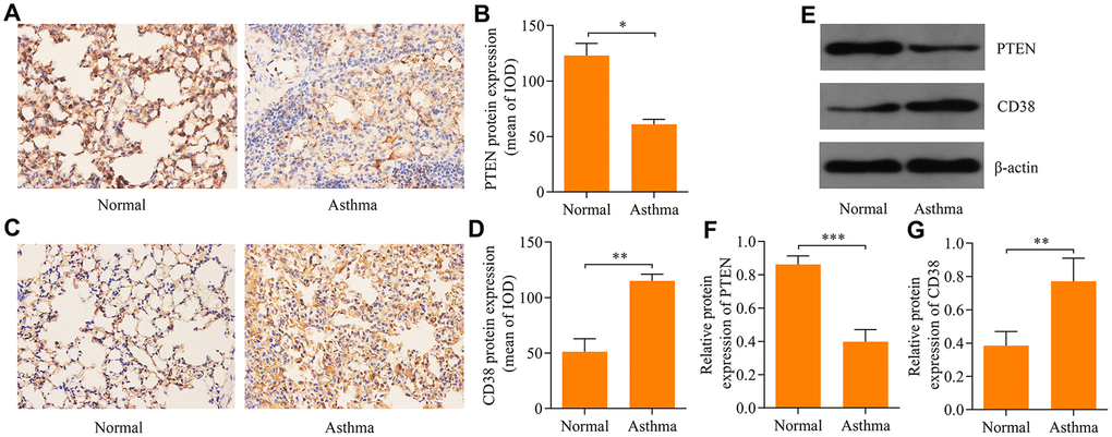 To confirm the involvement of PTEN and CD38 in the pathogenesis asthma, we examined protein expression levels of PTEN and CD38 in the lung tissue of asthmatic mice using immunohistochemistry. Results revealed that PTEN expression decreased (Figure 5A, 5B), while CD38 expression was elevated (Figure 5C, 5D) in the lung tissue of asthmatic mice. Moreover, Western blot confirmed that levels of PTEN and CD38 expression were reduced and elevated, respectively, in lung tissues of asthmatic mice (Figure 5E–5G). Therefore, these data confirm the involvement of PTEN and CD38 in asthma.