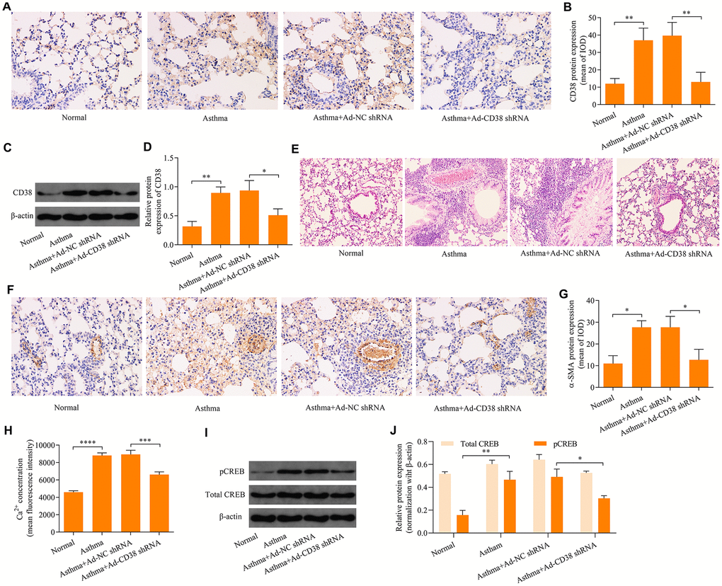 To explore the effect of CD38 in the regulation of airway remodeling in asthma, we downregulated CD38 expression in the lung tissue of asthmatic mice via intratracheal injection of adenovirus-expressing CD38 shRNA. Downregulation of CD38 in the lung tissue of mice was confirmed using immunohistochemistry (Figure 6A, 6B) and Western blot (Figure 6C, 6D) analyses. HE staining of lung tissue revealed that mice infected with Ad-CD38 shRNA exhibited reductions in airway epithelium thickening and inflammatory cell infiltration within peribronchiolar tissue (Figure 6E). Notably, immunohistochemistry analysis revealed that that CD38 knockdown was associated with decreased ASM cell mass in the lung tissues of asthmatic mice (Figure 6F, 6G). Moreover, knockdown of CD38 significantly decreased the induction of Ca2+ (Figure 6H) and CREB phosphorylation (Figure 6I–6J) in lung tissues of asthmatic mice. Taken together, these results indicate that CD38 knockdown inhibits airway remodeling in asthmatic mice and is associated with downregulation of the induction of Ca2+ and CREB phosphorylation.