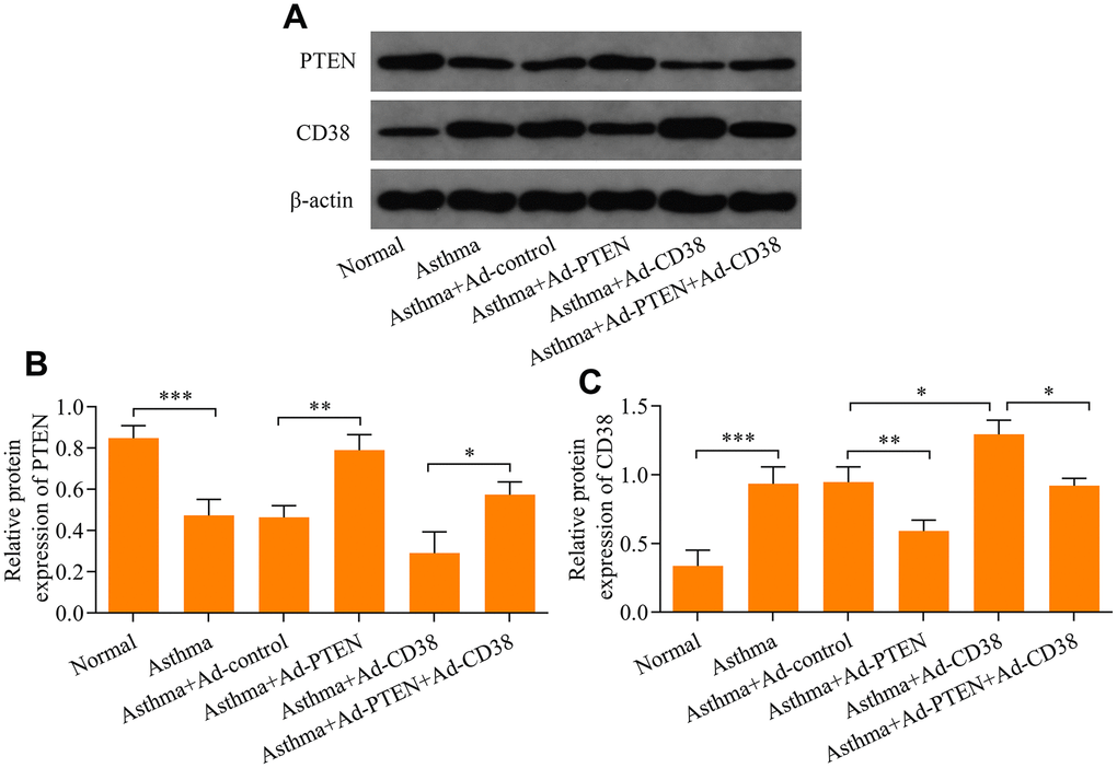 Certain limitation of our study should be noted. In this study, our data demonstrated that PTEN overexpression or CD38 silencing markedly attenuated the airway remodeling and airway inflammation of asthmatic mice in vivo. However, we did not directly assess where these observed changes in airway remodeling and inflammation were associated with changes in airway function. Therefore, further studies are needed to detect the regulatory effect of PTEN/CD38 axis on the airway function, such as airway hyperresponsiveness.
