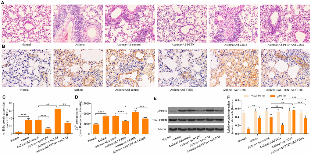 We further determined the role of PTEN in airway remodeling throughout the pathogenesis of asthma. We found that Ad-PTEN infection significantly enhanced expression of the PTEN protein in the lung tissue of asthmatic mice, and caused a marked reduction in the expression of the CD38 protein (Figure 7A–7D and Figure 8A–8C). Moreover, PTEN overexpression markedly attenuated airway remodeling, while CD38 overexpression exacerbated airway remodeling in asthmatic mice (Figure 9A–9C). Notably, CD38 overexpression attenuated PTEN overexpression-mediated suppressive effects on airway remodeling in asthmatic mice (Figure 9A–9C). In addition, PTEN overexpression was associated with decreased Ca2+ induction and CREB phosphorylation in the lung tissue of asthmatic mice, while CD38 overexpression produced opposite effects (Figure 9D–9F). CD38 overexpression also significantly reduced PTEN overexpression-mediated inhibitory effects on Ca2+ induction and CREB phosphorylation in the lung tissue of asthmatic mice (Figure 9D–9F). Collectively, these data indicate that PTEN suppresses airway remodeling, which is associated with the attenuation of Ca2+ induction and CREB phosphorylation via inhibition of CD38.