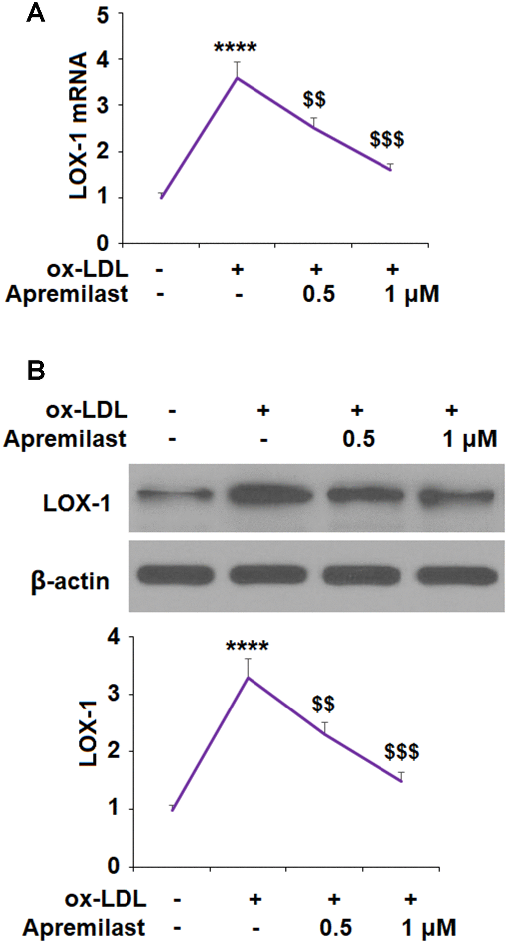 The molecular formula of apremilast is shown in Figure 1. It is a small molecule inhibitor weighing 460.5 g/mol with the molecular formula C22H24N2O7S (PubChem, 2020) We began by measuring the effect of apremilast on the expression of LOX-1 induced by ox-LDL. The results of real-time PCR and western blot analysis in Figure 2 show that apremilast reduced the expression and protein secretion of LOX-1 in a dose-dependent manner. While ox-LDL increased the mRNA expression of LOX-1 to 3.6-fold, it was reduced to 2.5- and 1.6-fold by 0.5 and 1 μM apremilast, respectively. A similar effect was observed at the protein level.