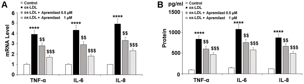 LOX-1 is the main scavenging receptor for ox-LDL. Enhanced expression of LOX-1 leads to increased foam cell formation, as LOX-1-expressing macrophages in the arterial wall display increased uptake of ox-LDL [21]. Targeting LOX-1 is considered an attractive treatment approach for atherosclerosis [22]. Here, we found that apremilast significantly decreased the expression of LOX-1, suggesting an inhibitory effect against foam cell formation. Proinflammatory cytokines are a major effector of atherogenesis. Inhibition of PDE4 by drugs including apremilast is known to suppress the expression of TNF-α. Apremilast has been shown to inhibit the expression of these three cytokines. For example, a phase III randomized clinical trial of apremilast found a significant decrease in TNF-α, IL-6, and IL-8 levels in psoriatic arthritis patients after 24 weeks of BID dosing [23]. Meanwhile, apreimlast-mediated inhibition of IL-8 was found to reduce neutrophil chemotaxis by 75% as well as inhibit the adhesion of neutrophils to human umbilical vein endothelial cells [24]. Another PDE4 inhibitor, NCS613 has been shown to reduce TNF-α, IL-6, and IL-8 expression via inhibition of p38 mitogen-activated protein kinase (MAPK) and nuclear factor-κB (NF-κB) [25]. Here, we found that apremilast significantly decreased ox-LDL-induced TNF-α, IL-6, and IL-8 expression, however, whether these pathways were involved remains unclear.
