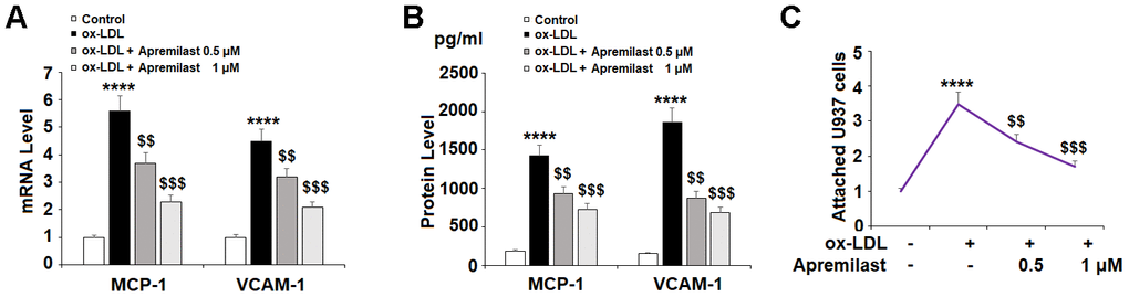 We confirmed that the suppression of MCP-1 and VCAM-1 reduced the adhesion of monocytes to endothelial cells by performing a cellular adhesion assay using HAECs and U937 monocytes stained with calcein-AM. The results in Figure 4C show that apremilast treatment did indeed inhibit ox-LDL-induced monocyte attachment to endothelial cells, demonstrating a potentially valuable anti-atherosclerotic effect.