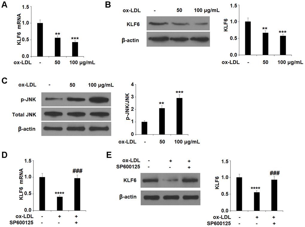 Finally, we explored the involvement of the KLF6 pathway through a series of experiments. First, we determined that ox-LDL dose-dependently downregulates the expression of KLF6 (Figure 5A, 5B), indicating a possible role of KLF6 in mediating ox-LDL-induced injury. Next, we determined that ox-LDL dose-dependently increased the phosphorylation of JNK (Figure 5C).