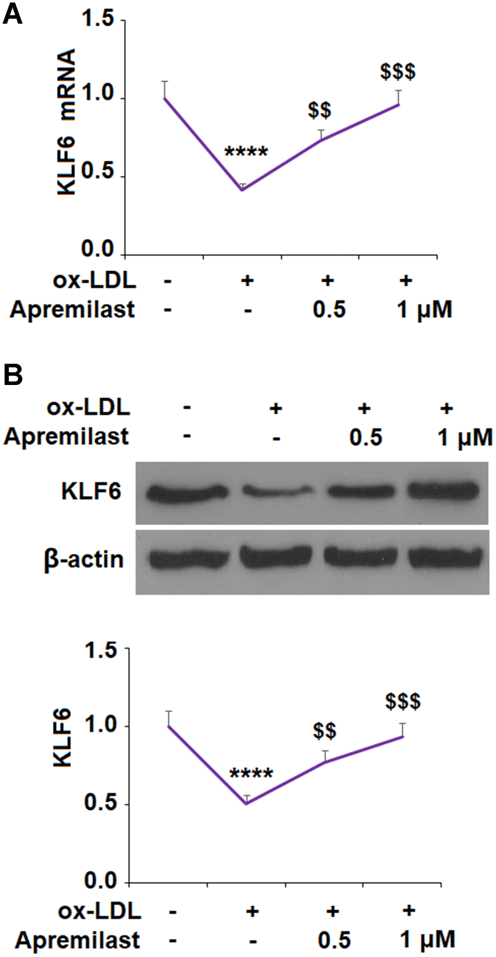 To ensure that JNK phosphorylation was involved in the ox-LDL-mediated decrease in KLF6 expression, we employed the JNK inhibitor SP600125. The results in Figure 5D, 5E confirm that JNK is required for ox-LDL-mediated reduction of KLF6 expression. Next, we measured the effects of apremilast on ox-LDL-induced inhibition of KLF6. As shown in Figure 6A and 6B, treatment with the two doses of apremilast remarkably rescued the mRNA and protein expression of KLF6 to near basal levels in the presence of ox-LDL.