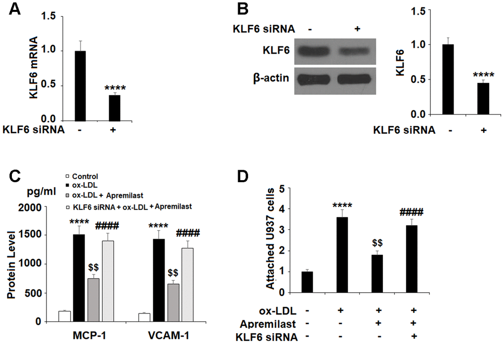 Lastly, we tested whether the effects of apremilast on MCP-1 and VCAM-1 expression were mediated through KLF6 by performing a KLF6 siRNA knockdown. Successful knockdown of KLF6 is shown in Figure 7A and 7B. As shown in Figure 7C, knockdown of KLF6 abolished the apremilast-mediated suppression of MCP-1 and VCAM-1. Concordantly, the results in Figure 7D show that knockdown of KLF6 also abolished the inhibition of monocyte attachment to endothelial cells induced by apremilast.