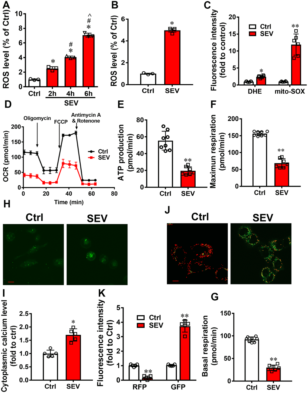 Mitochondria are the factories of cellular energy. The energy used to make ATP is actually derived from the mitochondrial membrane potential, a proton chemical gradient that forms across the mitochondrial inner membrane. Because we observed a decline in the mitochondrial membrane potential (Figure 1J, 1K; P<0.05) and an increase in cytoplasm calcium levels (Figure 1H, 1I; P<0.05) in H4 cells treated with sevoflurane, we then measured the OCR to evaluate mitochondrial respiratory function. Sevoflurane treatment significantly inhibited mitochondrial respiration (Figure 1D–1G; P<0.01). All data indicated that sevoflurane disrupted the mitochondria balance in H4 cells.