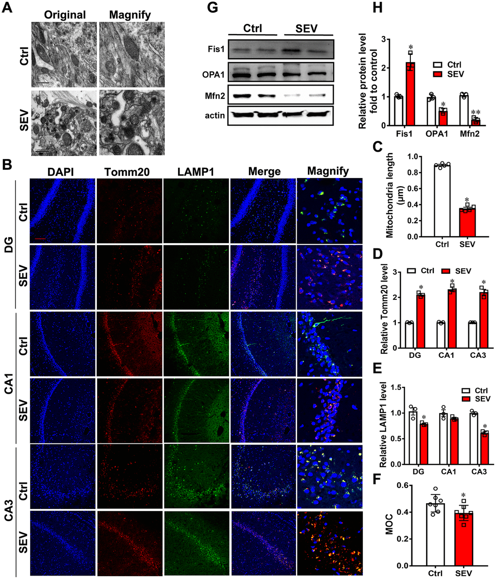 To examine the impact of sevoflurane on aged rats, 18-month-old rats were treated with 2% sevoflurane for 5 h (SEV group), and the mitochondria were observed using cryo-electron microscopy. We observed that the longest diameter of mitochondria was smaller after sevoflurane treatment. (Figure 2A, 2C; P<0.05; Supplementary Figure 1C). Moreover, immunofluorescence assays of Tomm20 and LAMP1 abundance revealed that the fluorescence intensity of Tomm20 was significantly elevated, while the fluorescence intensity of LAMP1 was reduced in the DG, CA1 and CA3 regions (Figure 2B). Quantitative analysis showed that the Tomm20 level (in DG, CA1 and CA3) was higher in the SEV group than in the Ctrl group (Figure 2D; P<0.05), while the LAMP1 level (DG and CA3) was lower in the SEV group than in the Ctrl group (Figure 2E; P<0.05). Sevoflurane also decreased the Manders’ overlap coefficient (MOC), which was used to quantify the degree of colocalization between fluorophores [24], for Tomm20 and LAMP1 in the hippocampus of aged rats (Figure 2F). Sevoflurane could not change the mRNA level of Tomm20 and LAMP1 (Supplementary Figure 1B). The expression of Fis1, OPA1 and Mfn2 is are involved in dynamic mitochondrial fusion and fission, which maintain the mitochondrial network in a healthy state. Sevoflurane increased the expression of Fis1 and reduced the expression of OPA1 and Mfn2 in the hippocampus of aged rats (Figure 2G, 2H; P<0.05). Sevoflurane reduced the Mfn2 expression in the hippocampus of aged rats (Supplementary Figure 1B). These data suggested that sevoflurane causes mitochondria impairment in aged rats.