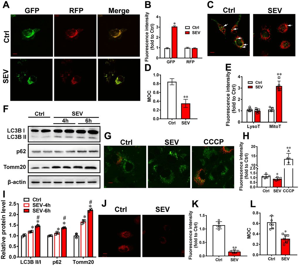 Mitophagy is an evolutionarily conserved cellular process in which dysfunctional or superfluous mitochondria are removed. To investigate whether mitophagy is induced post sevoflurane administration, AdM-CMV-mCherry-EGFP-LC3B adenoviruses were transfected into H4 cells. GFP fluorescence is quenched in the acidic pH of the lysosomal compartment, thereby limiting the use of EGFP-LC3B for the identification of autophagosomes. However, mCherry continues to fluoresce, and mCherry-LC3 can be used to identify both autophagosomes and autolysosomes. Quantification of immunofluoresence showed that the fluorescence intensity of GFP was stronger in the SEV group than in the Ctrl group, but there was no difference in the fluorescence intensity of RFP between these groups (Figure 3A, 3B; P<0.05). In addition, sevoflurane decreased the Manders’ overlap coefficient for GFP and RFP. (Figure 3D). Furthermore, we measured mitophagic flux by employing mt-Keima. Addition of the mitophagy inducer CCCP dramatically increased red fluorescence in H4 cells, suggesting that mitophagy was induced. Cells treated with sevoflurane had lower red fluorescence compared with control cells (Figure 3G, 3H; P<0.05). These data suggested that sevoflurane causes mitophagy dysfunction in H4 cells.