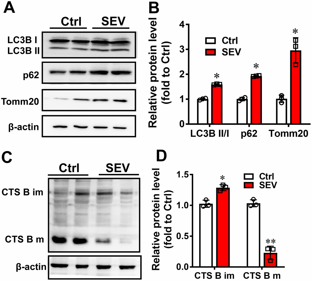 Sevoflurane also impacted mitophagy in vivo. In the hippocampus, LC3B II/I, p62 and Tomm20 expression was also upregulated in the SEV-6h group compared with the Ctrl group (Figure 4A, 4B; P<0.05). We also examined the expression of cathepsin B in lysosomes in response to sevoflurane. Cathepsins are the most extensively studied of the lysosomal proteases that participate in autophagic degradation [26]. The results showed that the expression of cathepsin B was lower in the hippocampus of aged rats following sevoflurane treatment. Moreover, the mature forms of cathepsin B almost disappeared after sevoflurane treatment (Figure 4C, 4D; P<0.05). These data suggest that sevoflurane also induced lysosomal function impairment. All data suggested that sevoflurane leads to mitochondria accumulation, blocks autolysosome formation and inhibits mitophagic flux.