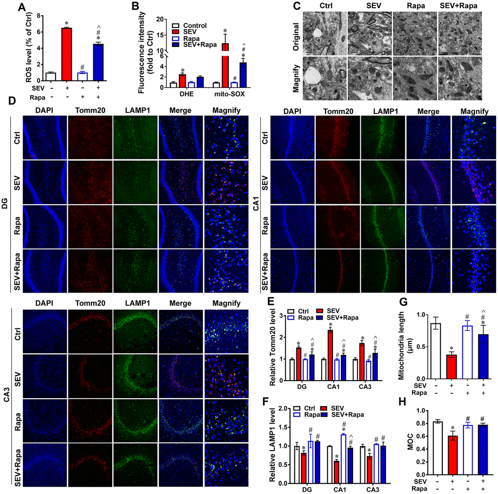 Next, eighteen-month-old rats were administrated with rapamycin following sevoflurane treatment. Rapamycin improved the mitochondria morphology in the hippocampus of aged rats, as determined by analysis of reconstructions of mitochondria from cryo-electron microscopy images. The longest diameter of mitochondria was smaller in the SEV group than in the Ctrl group, but was larger in the SEV+Rapa group than in the SEV group (Figure 5C, 5G; P<0.05). Immuno-staining assays were also performed to measure the expression of LAMP1 and Tomm20 in the DG, CA1 and CA3 regions. Fluorescence imaging and quantitative data indicated that the fluorescence intensity of LAMP1 was lower and the fluorescence intensity of Tomm20 was higher in the SEV group compared with the Ctrl group in all three regions. In addition, the fluorescence intensity of LAMP1 was higher and the fluorescence intensity of Tomm20 was lower in SEV+Rapa group than in the SEV group in all three regions (Figure 5D–5F; P<0.05). Sevoflurane decreased the Manders’ overlap coefficient for Tomm20 and LAMP1 in the hippocampus, and the Manders’ overlap coefficient was higher in SEV+Rapa group than in the SEV group (Figure 5H; P<0.05). These results indicated that rapamycin improves mitochondria function after sevoflurane treatment.
