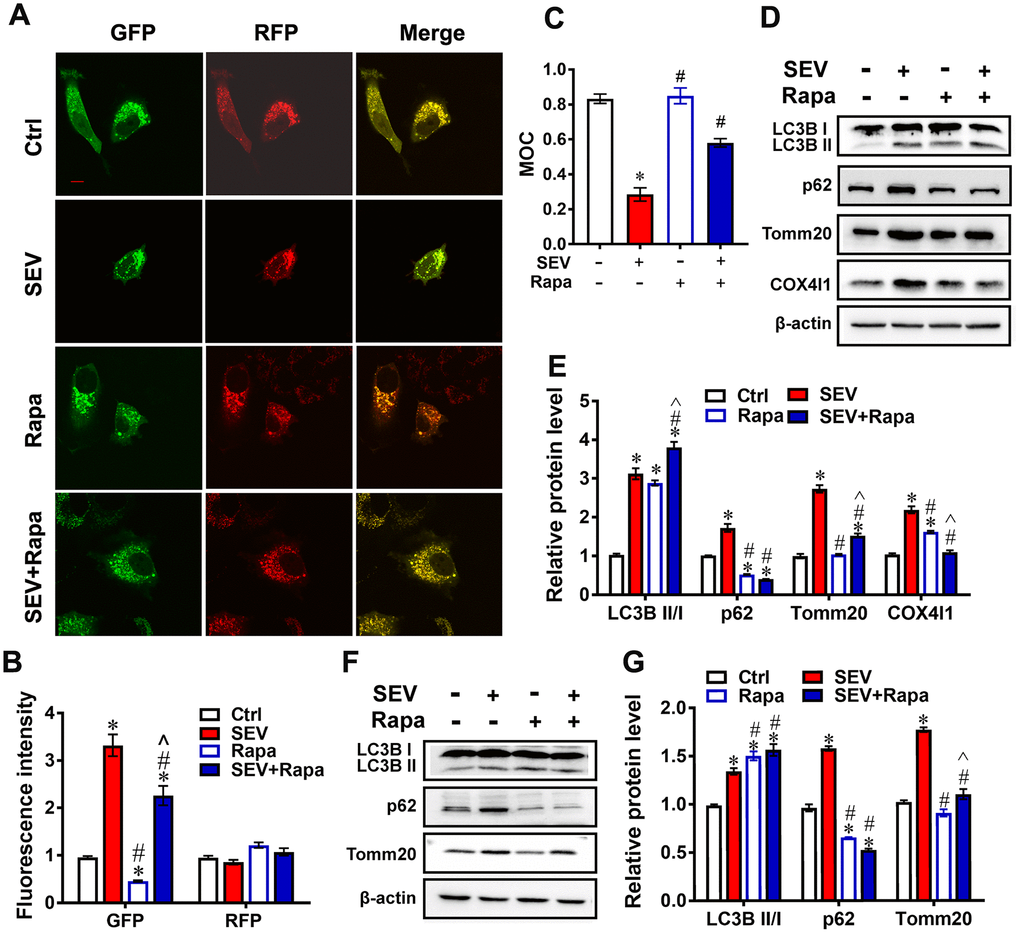 in the SEV group compared with the Ctrl group, but was lower in the SEV+Rapa group than in the SEV group (Figure 6A, 6B; P<0.05). The decrease in GFP fluorescence indicated that rapamycin restored autophagic flux. Next, a western blotting assay was employed to detect the protein levels of the autophagy markers LC3B II/I, p62, Tomm20 and COX4l1 in primary cultured neurons. The results showed that the expression of all four proteins was higher in the SEV group than in the Ctrl group. LC3B II/I expression was higher and p62, Tomm20 and COX4l1 expression was lower in the SEV+Rapa group than in the SEV group (Figure 6D, 6E; P<0.05). In the rat hippocampus, LC3B II/I expression was higher in the SEV+Rapa group than in the SEV group, and p62 and Tomm20 expression was lower (Figure 6F, 6G; P<0.05). Overall, these results indicated that rapamycin reversed sevoflurane-induced mitophagy dysfunction.