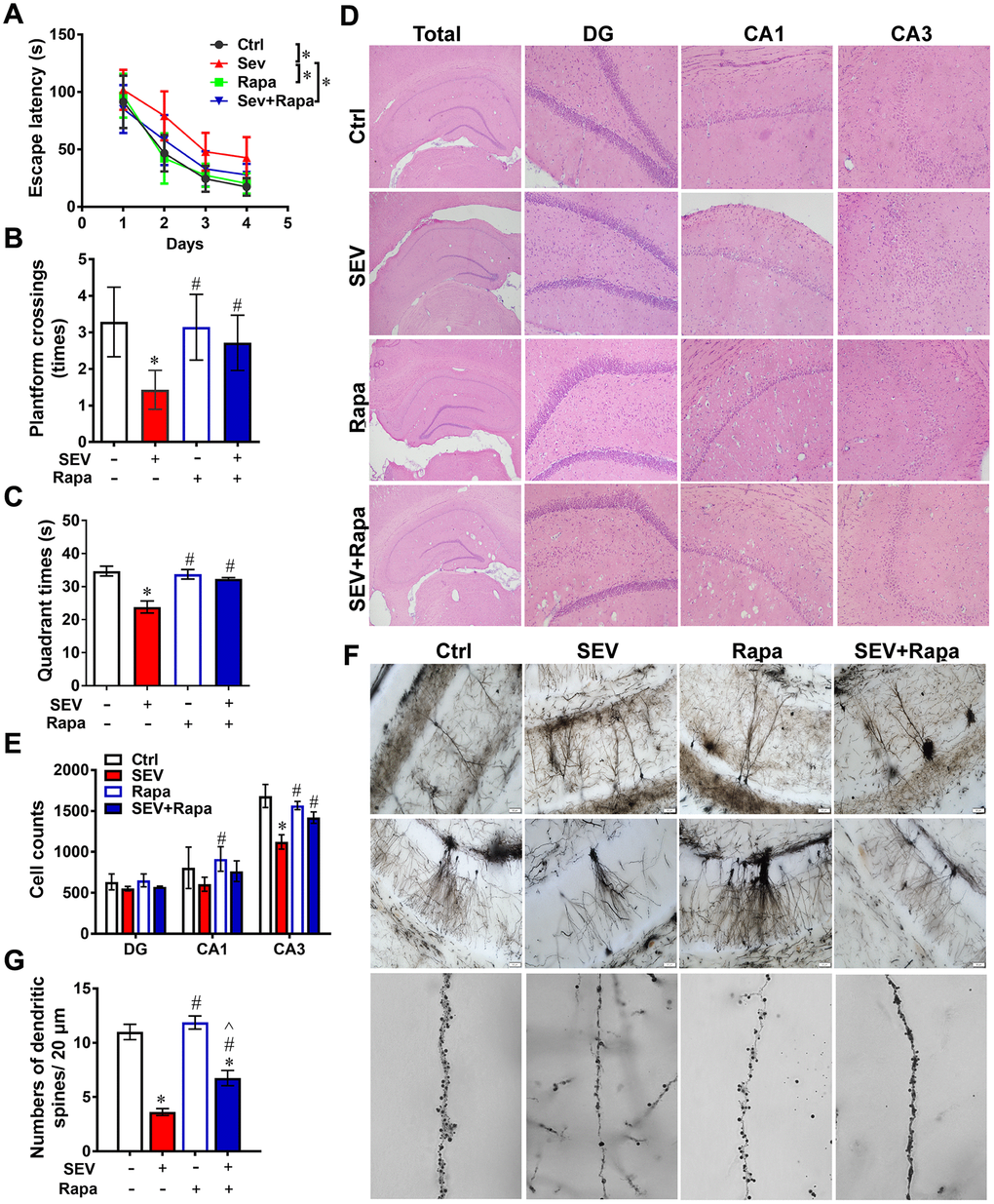 Hematoxylin and eosin staining were performed to assess the effect of sevoflurane administration on hippocampal pyramidal neurons. The quantitative data showed that the number of cells in the CA3 region was lower in the SEV group than in the Ctrl group, and higher in the SEV+Rapa group compared with the SEV group. However, there was no significant difference in the number of cells in the DG and CA1 regions (Figure 7D, 7E; P<0.05). The morphology of neuronal dendrites and dendritic spines were observed using Golgi-Cox staining. The dendrite length (measured from the base of the dendrite to the tip of the dendrite) and the number of spines on the dendrite were analyzed. The results showed that the number of dendrites longer than 20 μm was lower in the SEV group compared with the Ctrl group, but higher in the SEV+Rapa group than in the SEV group (Figure 7F, 7G; P<0.05). A decline in the number of dendritic spines in the hippocampus and hippocampal pyramidal neurons led to cognitive dysfunction in aged rats. Rapamycin relieved the sevoflurane-induced decrease in the number of hippocampal pyramidal neurons and dendritic spines in the hippocampus and ameliorated cognitive deficits.