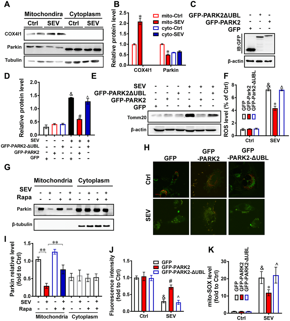 To elucidate the potential mechanism by which sevoflurane administration induces mitophagy dysfunction, western blotting assays were performed to measure Cox4l1 and Parkin protein accumulation in mitochondria and the cytoplasm. H4 cells were treated with 4.1% sevoflurane. The mitochondria proteins and cytoplasmic proteins in the Control group and SEV group were extracted. The results suggested that Cox4l1 protein expression was higher in the mito-SEV group than in the mito-Ctrl group, but that Parkin protein expression was lower in the mito-SEV group (Figure 8A, 8B; P<0.05). EGFP-PARK2 plasmid-transfected H4 cells had decreased intracellular and mitochondrial ROS levels after sevoflurane treatment. This protection was not observed in cells transfected with EGFP-PARK2ΔUBL, which encodes a mutant PARK2 protein without ubiquitin E3 ligase activity (Figure 8F, 8K; P<0.05). The accumulation of these proteins after transfection was verified by western blotting against GFP (Figure 8C) Consistent with the decrease in ROS levels, PARK2 transfection enhanced mitophagy, as reflected by a decreased Tomm20 level, suggesting that the E3 ligase function of PARK2 is essential for maintaining mitochondria balance in the presence of sevoflurane. (Figure 8D, 8E; P<0.05). Rapamycin rescued the expression levels of Parkin in mitochondria in the hippocampus of aged rats upon sevoflurane treatment (Figure 8G, 8I; P<0.01). Next, H4 cells were transfected with mt-Keima reporters and plasmids encoding pEGFP, pEGFP-PARK2 or pEGFP-PARK2ΔUBL (loss-of-function mutation) to monitor mitophagic flux after sevoflurane treatment. Overexpression of PARK2 alleviated mitophagy dysfunction induced by sevoflurane (Figure 8H, 8J; P<0.05). Therefore, these results indicate that PARK2-induced mitophagy may be required to maintain a healthy between energy and ROS production in mitochondria after sevoflurane treatment.