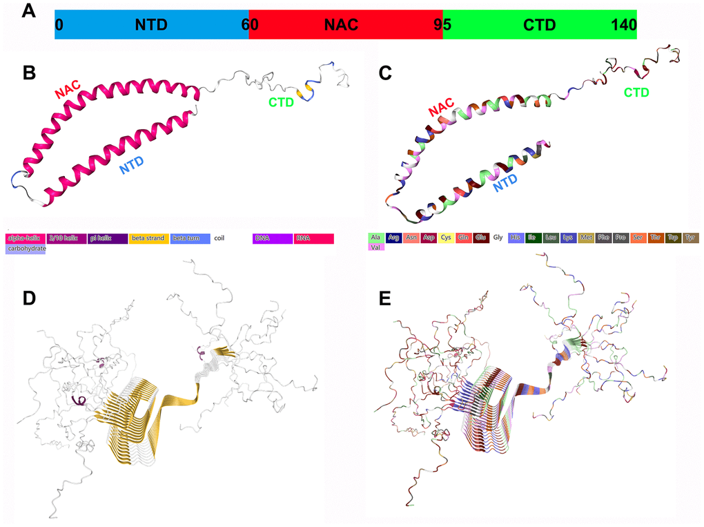 α-Syn is composed of 140 amino acids. Snca encodes α-Syn, and wild-type (WT) α-Syn is an inherently disordered protein (IDP). The gene encoding the protein is located on human chromosome 4 and occupies a region of approximately 114 kb in the genome. α-Syn accounts for 1% of the total protein content of neurons and has a predominantly presynaptic localization. It is widely distributed within neurons and is found in the cytoplasm, nucleus, mitochondria, and mitochondria-associated membranes. In the cytoplasm, one-third of the protein binds to the synaptic membrane [1–3]. α-Syn has no persistent structure under physiological conditions and is mainly monolithic and inherently disordered.