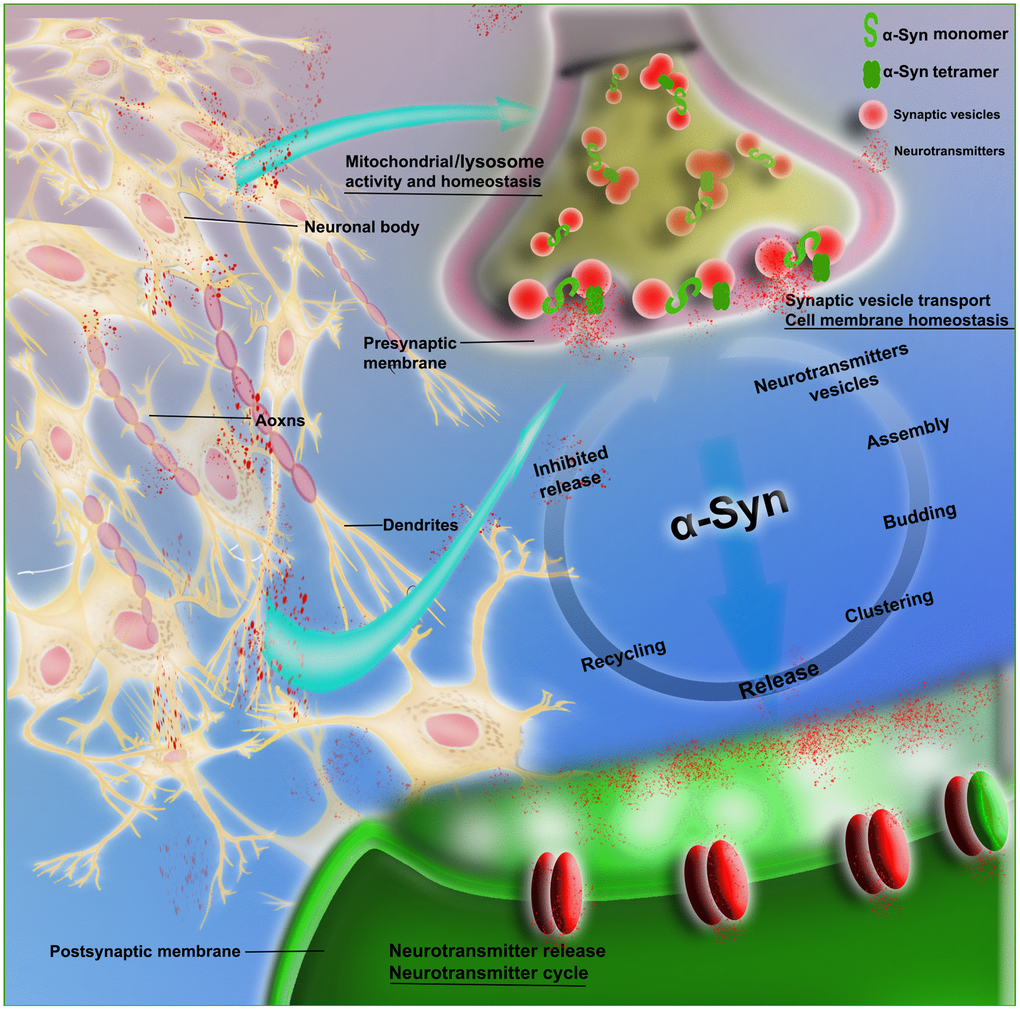 α-Syn participates in synaptic vesicle transport and neurotransmitter synthesis and release