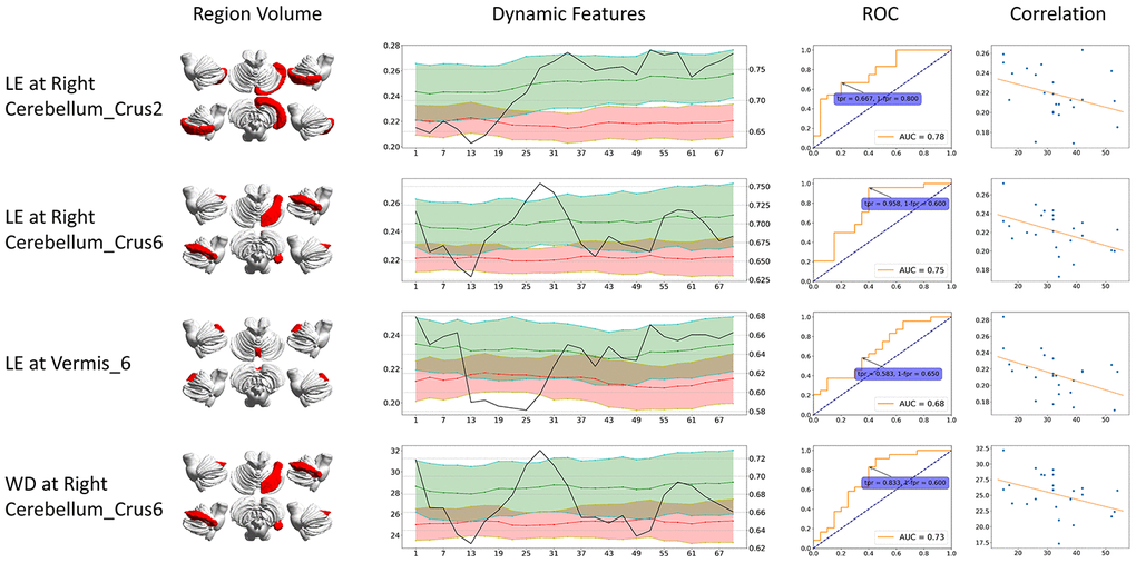 For dynamic feature results, BC at left frontal eye field (BA8), CCFS at right VACC, LE at right Cerebellum_Crus1 (AR92), right Cerebellum_Crus2, right Cerebellum_Crus6 and Vermis_6, WD at right Cerebellum_Crus6 were both significantly different and correlated with scores. Patients showed reduced CCFS, LE and WD values at these regions, while with decreased BC at left frontal eye field. The correlations of BC with scores were positive, whereas CCFS, LE and WD were negatively correlated with scores (Table 2).