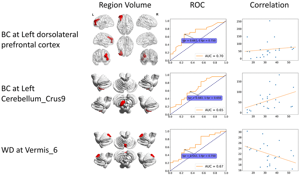 Figure 3. Static specific significant features. These features can only be identified from static functional connectivity. The 3D region volume was shown, as well as the ROC curve and correlation with clinical scores. The correlation is between clinical score (x-axis) and features (y-axis). BC: betweenness centrality; CCFS: clustering coefficient; LE: local efficiency; WD: weighted degree.