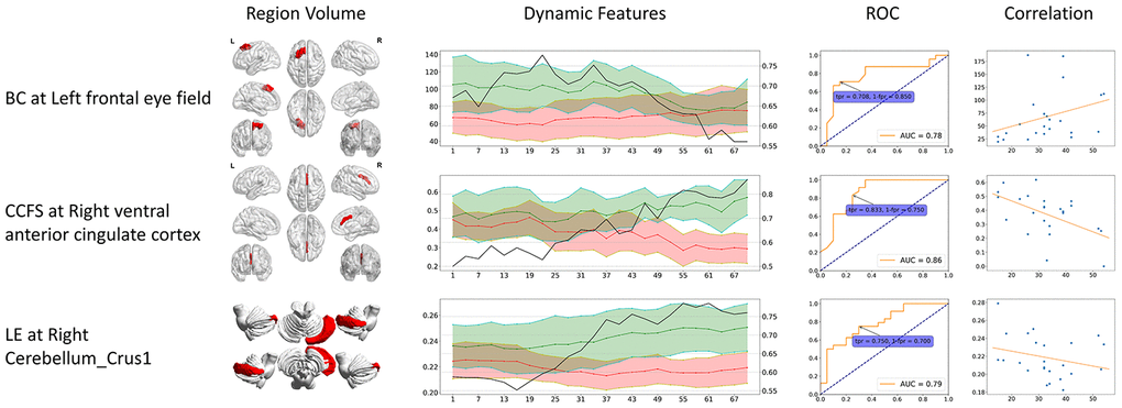 Figure 4. Dynamic specific significant features. These significant features can only be identified from dynamic functional connectivity. The 3D region volume was shown, as well as the dynamic features line plots. Green stands for healthy controls, red stands for CMSA patients (value on the left axis), and black line stands for ROC AUC (value on the right axis). The ROC curve at the time point when AUC reached its maximum is shown. The correlation is between clinical score (x-axis) and features (y-axis). BC: betweenness centrality; CCFS: clustering coefficient; LE: local efficiency; WD: weighted degree.
