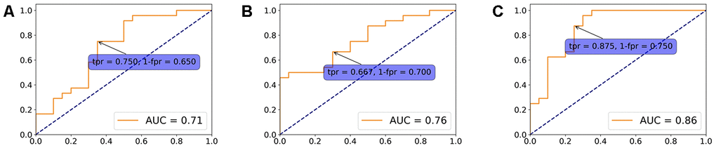 Figure 5. Logistic regression model. A logistic regression model using overlapping (A), static specific (B) and dynamic specific features (C) with regularization parameter C = 1. ROC curves were plotted to evaluate the classifier performance.