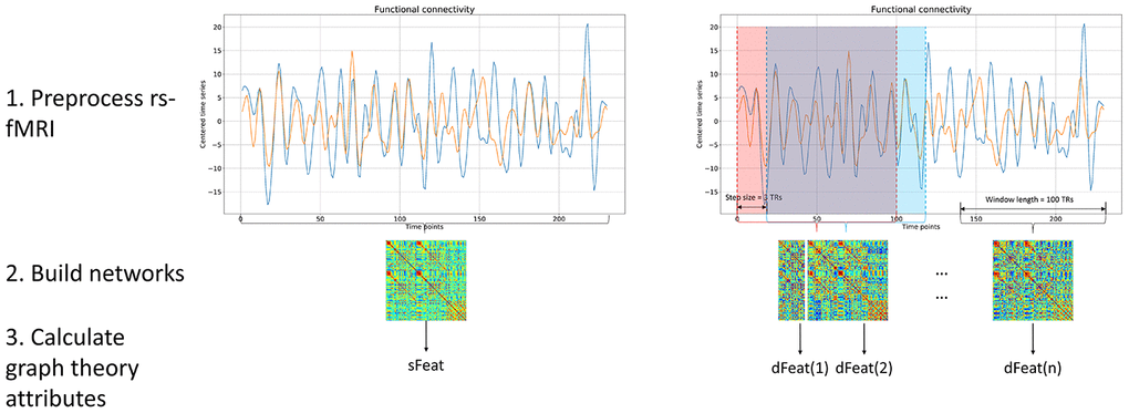 Figure 6. Processing pipeline. Both static and dynamic functional connectivity was calculated based on BOLD fMRI signal. For static functional connectivity, the pair-wise Pearson correlation between two regions was obtained using the whole time series. For dynamic functional connectivity, we utilized the sliding window method to produce a range of functional networks. After network construction, graph theory attributes were calculated based on each functional networks, yielding sFeat for static feature, and dFeats for dynamic features.