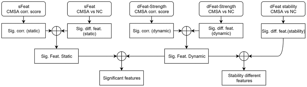 Figure 7. Statistical analysis procedure. At the first stage, comparison and correlation analysis was performed for static and dynamic features separately. At the second stage, significantly different and correlated features were combined. At the third stage, significant features found by static and dynamic functional connectivity were merged, as well as incorporating dynamic stability measurements. The circle-plus sign stands for intersection. sFeat, static feature; dFeat, dynamic feature; corr., correlate; Sig., significant; Feat, feature; diff, difference.