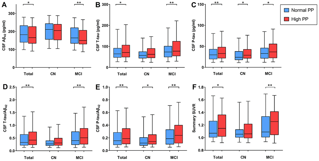 CSF measurements were available for 977 non-demented participants at baseline (n = 364 CN, 613 MCI), of whom 517 had normal PP. In cross-sectional analyses, after excluding extreme outlines, high PP was associated with a decrease in Aβ42 (β = -.525, P = .015, Figure 1A), as well as increases in T-tau (β = .077, P = .011, Figure 1B), P-tau (β = .097, P = .003, Figure 1C), T-tau/Aβ42 (β = .131, P = .004, Figure 1D) and P-tau/Aβ42 (β = .157, P = .001, Figure 1E) after adjustment for age, gender, education, APOE Ɛ4 carrier status, vascular risk factors, cognitive diagnosis and extracted CSF volume. When stratified by cognitive diagnosis, the associations between PP and CSF biomarkers still persisted within MCI group and high PP was associated with higher P-tau and P-tau/Aβ42 levels in CN group (Figure 1C and 1E); when stratified by age, the associations between PP and CSF biomarkers still persisted within very old group and PP elevation was associated with increased T-tau/Aβ42 in young old group (Supplementary Table 2).