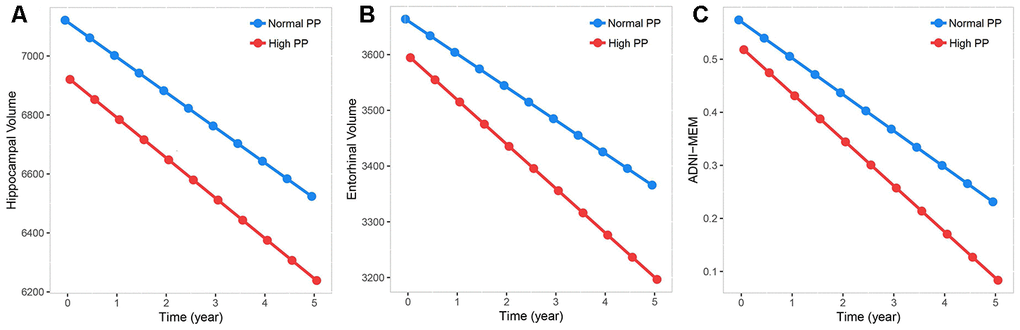 Measurements of hippocampal, entorhinal, and mid-temporal volumes were available in 1,137 participants at baseline (n = 694 MCI), of whom 554 had high PP. In cross-sectional analyses, after excluding extreme outlines, increased PP was not associated with hippocampal volume (β = -1.084*e3, P = .312), entorhinal volume (β = -2.311*e1, P = .554), or mid-temporal volume (β = 4.364*e1, P = .752) when adjusted for age, gender, education, APOE Ɛ4 carrier status, vascular risk factors, cognitive diagnosis and intracranial volume. Similarly, no associations were detected between PP and MRI structure when the analyses were stratified by cognitive diagnosis and age (Supplementary Table 3).