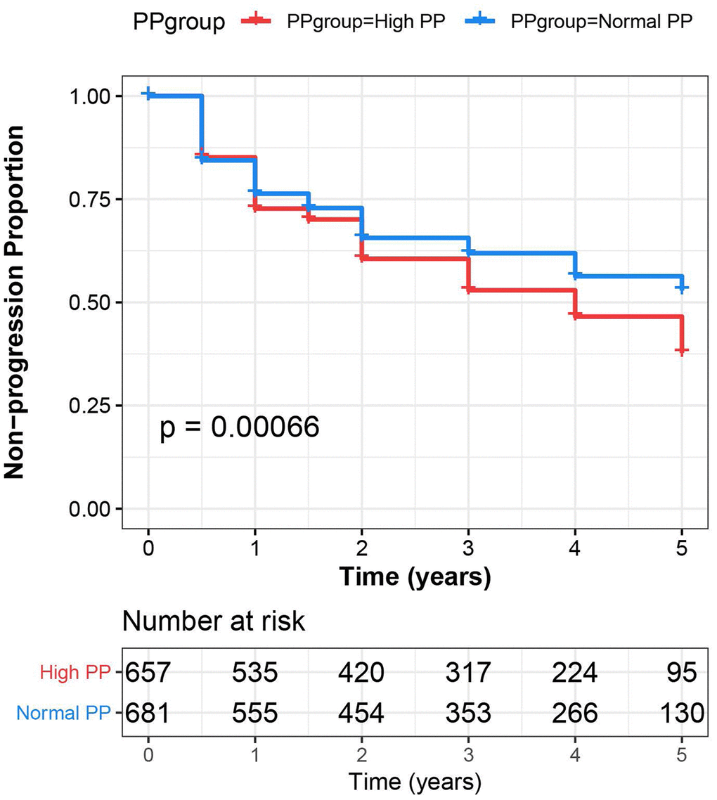 Kaplan-Meier analysis revealed participants with high PP at baseline showed more rapid progression over the following five years, compared with those with normal PP (P <.001, Figure 3). In Cox regression models (adjusted for age, gender, education, APOE Ɛ4 carrier status, vascular risk factors and cognitive diagnosis), the individuals with high PP had a higher risk of progression to AD (hazard ratio 1.216, 95% CI 1.051-1.461, P = .011).
