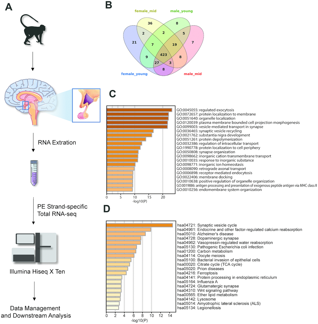 To generate the gene expression profiles in each group, we compared the gene expression levels among the female_young, female_mid, male_young and male_mid groups (see Methods). Among the top 500 genes of each group, 423 were overlapped genes (Figure 1B–1D). Most of these overlapping genes were enriched in cellular functions such as regulated exocytosis, organelle localization, synaptic vesicle cycle, etc. Intriguingly, Kyoto Encyclopedia of Genes and Genomes (KEGG) pathway enrichment analysis of the overlapping genes showed enrichment in some neuropsychiatric diseases, such as Alzheimer’s disease (AD) and amyotrophic lateral sclerosis (ALS), in addition to oocyte meiosis. The Gene Ontology (GO) biological processes of the top 500 genes in each group are shown in Supplementary Figure 1. For instance, compared with other groups, the top genes in female_mid group showed enrichment in chemical synaptic transmission, which might indicate a more robust function of extracellular communication in the hypothalamus of female middle-aged macaques.