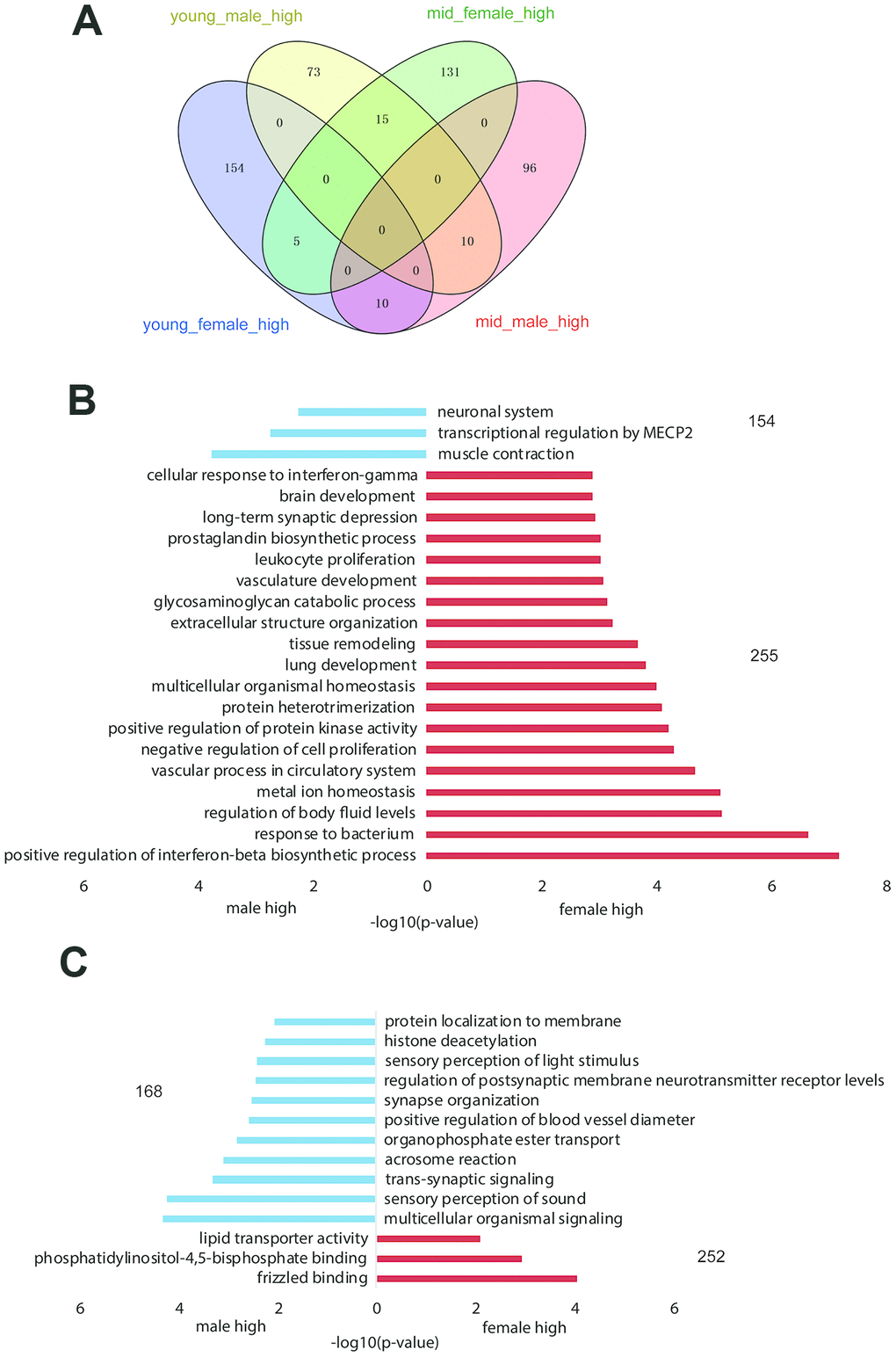 We compared gene expression between the hypothalami of male versus female rhesus macaques and young versus middle-aged rhesus macaques (see Methods) to identify potentially sex-related genes (Figure 2A, Supplementary Datas 1–4) and age-related genes (Supplementary Datas 5–8). The GO functional enrichment results of differentially expressed genes by sex are shown in Figure 2B, 2C. The number of female_high genes was higher than that of male_high genes in both the young-aged and middle-aged samples (255 vs. 154 and 252 vs. 168, respectively), indicating that gene expression was more active in the hypothalami of female than male rhesus macaques.