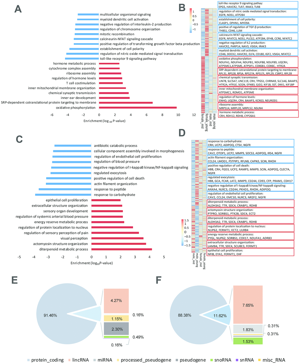 To explore the reason for the strong gender differences in hypothalamic gene expression during aging, we analyzed the gene types of age-related differentially expressed genes in the female and male hypothalamic (Figure 3E, 3F). Importantly, in addition to the protein coding genes, lincRNAs accounted for a considerable proportion of these age-related differentially expressed genes, suggesting that lincRNAs might be involved in the process of reproductive aging. Moreover, we performed western blotting to 8 age-related differentially expressed genes in females (Supplementary Figure 2A, quantification of western blot in Supplementary Table 4), and the results of western blots were consistent with the differentially expressed gene lists (Supplementary Data 1–8) and the heatmaps shown in Figure 3B.