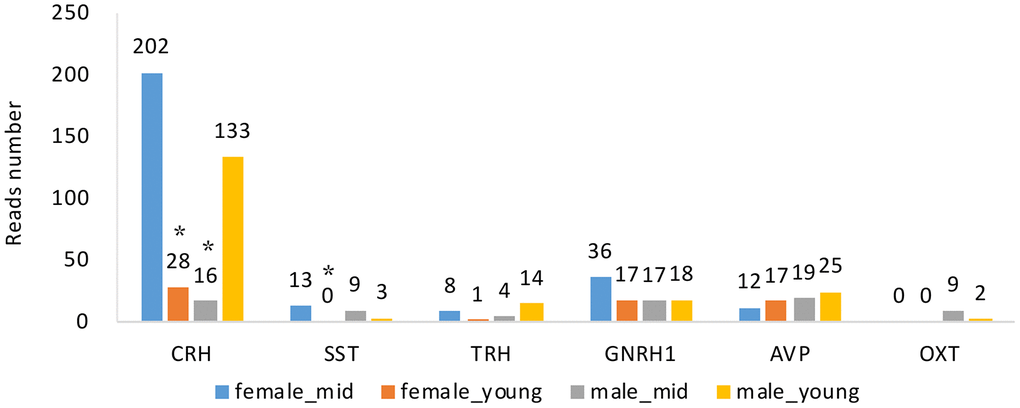 Changes in hormone levels are essential in reproductive aging [15]. To determine the changes in hormone gene expression with aging, we compared the RNA levels of CRH, somatostatin (SST), thyrotropin-releasing hormone (TRH), GNRH1, arginine vasopressin (AVP) and oxytocin (OXT) among the 4 groups (see Methods). We analyzed the expression of GNRH1 instead of GNRH2 since GNRH1 exerts its control in mammalian reproduction by stimulating the synthesis and release of LH and FSH [16]. By searching the differentially expressed gene lists (Supplementary Data 1–8), we found that apart from CRH and SST (p value < 0.05), the gene expression of hormones secreted by the hypothalamus did not show any differences among the groups (Figure 4). The expression level of GNRH1 was slightly higher in the female_mid group than in the female_young group, but the difference was not statistically significant (p value > 0.05). We also performed qPCR to CRH and SST to confirm our the mRNA expressions of CRH in female_young and male_mid group were significantly lower than that in female_mid group. And mRNA expression of SST in female_young group was significantly lower than that in female_mid group. Thus, we inferred that CRH and SST were crucial in reproductive aging. The role of the HPA axis (containing CRH) in aging has been proven in some studies [17], but further research is needed to explore its roles in reproductive aging.