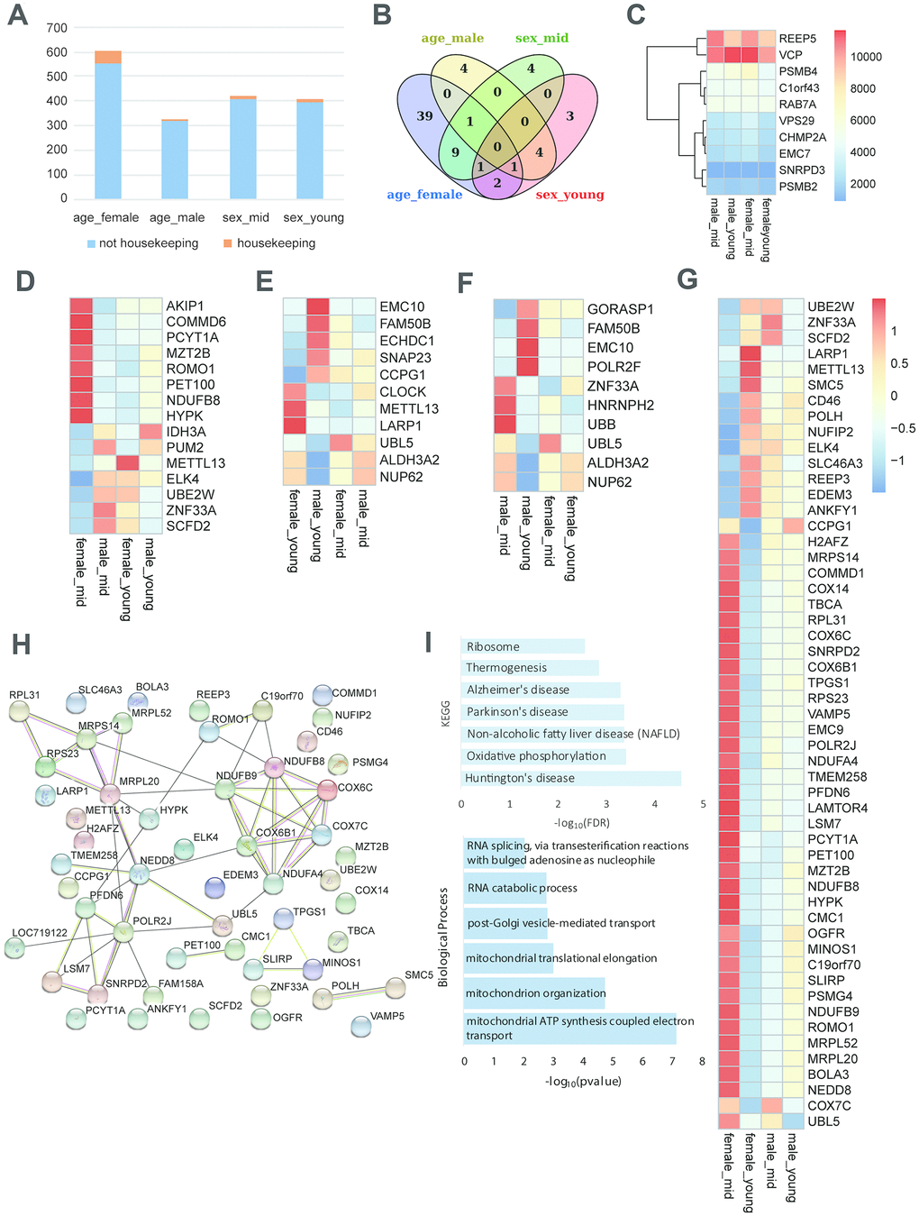 To investigate the role of housekeeping genes in reproductive aging, we compared the proportion of housekeeping genes in the differentially expressed genes among the rhesus macaques grouped by age and gender. As shown in Figure 5A, the proportion of housekeeping genes was higher in the age_female comparison than in the other comparisons, revealing that housekeeping gene expression in females was more susceptible to age than that in males. Venn diagram analysis showed that the number of differentially expressed genes in the age_female group was much higher than that in the other group (39 vs. 4/4/3). Further analysis of the differentially expressed housekeeping genes among the 4 groups revealed that the expression of the 68 housekeeping genes varied with gender and age (Figure 5A, 5B). We also performed qPCR and western blotting to the top 6 differentially expressed housekeeping genes between female_young and female_mid groups (Supplementary Figure 2B, 3B, quantification of western blot in Supplementary Table 4), and the expression changes of these genes were consistent with the heatmap shown in Figure 5G. Moreover, these age-related housekeeping genes in the female hypothalamus were highly enriched in neurodegenerative disorder- and metabolism-related pathways, such as AD, Parkinson’s disease, mitochondrial and ribosomal functions, as well as oxidative phosphorylation (Figure 5I). The protein interactions of differentially expressed housekeeping genes between the hypothalami of middle-aged and young female macaques were quite complicated. As shown in Figure 5H, NDUFB9, NDUFB8, NDUFA4, COX6B1, COX6C and COX7C compromised an interaction network with reaction, transcriptional regulation and posttranslational modification. These proteins participate in cellular respiration, and interact with some proteins mediating mitochondrial function, metabolism and ROS increasing (MRPL20, MRPS14, UBL5, ROMO1, etc.).