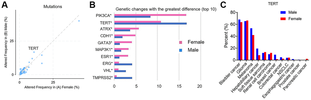 In our study, we showed the top 10 genes with the greatest difference of mutations, which were related to sex disparity. This variation (genetic mutation) may help facilitate the identification of sex-specific cancer biomarkers. We found that PIK3CA and TERT were genes with the greatest differences between different sex groups. Strikingly, TERT mutation could be frequent in many malignancies and be identified as biomarkers of tumor aggressiveness and poor prognosis in several human cancer types [14–17]. We further analyzed the frequency of TERT mutations between different sex groups in different cancer types. The result showed that Bladder Cancer, Glioma and Melanoma were the top three of TERT mutation frequency, while Esophagogastric cancer, Prostate cancer, and Pancreatic cancer were the last three. Consistent results have also been confirmed the high prevalence of TERT mutation in bladder cancer, Glioma and Melanoma and a lower mutation frequency of breast cancer and prostate cancer, although they occurred with different frequencies [21–25]. Moreover, we also found that TERT mutation frequency of Melanoma and Hepatobiliary cancer was higher in male patients than female patients. Lee et al analyzed TERT promoter mutation in 162 tumor samples of the patients with HCC by sequencing and real-time PCR, respectively. The result showed that the TERT promoter mutation rate was 28.8% (46/160) in HCC and was associated with males (p =0.027) [26]. Egberts et al also found highly recurrent TERT promoter mutations in malignant melanomas, and the prevalence of its TERT-promoter mutations was associated with the patient's sex [23 (51.1%) men, 10 (21.3%) women; p = 0.004] [27]. The above results suggested that TERT mutation might be closely related to sex, although efforts are still needed to evaluate the clinical utility of sex-biased TERT mutation in a larger patient cohort.