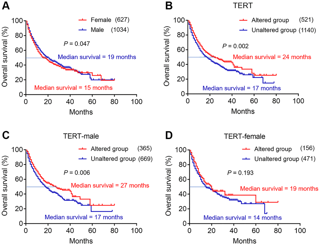 We first explored the association between sex and overall survival (OS) in the immunotherapy cohort. As shown in Figure 2A, male patients had significantly better median OS than female patients (19 months vs 15 months, p =0.047). From the above results, we found that TERT mutation was related to sex disparity. We also explored the predictive value of TERT mutation on the efficacy of immunotherapy. Surprisingly, patients in the TERT altered group showed a significantly longer median OS than unaltered group (Figure 2B, 24 months vs 17 months, p =0.002).