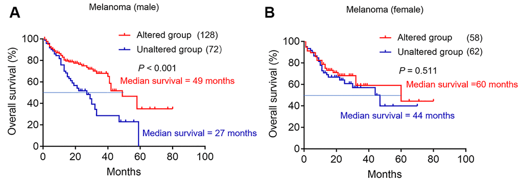 To explore the predictive value of TERT mutation on the efficacy of immunotherapy in certain cancer types. The cancer types including non-small cell lung cancer, melanoma, bladder cancer, renal cell carcinoma, head and neck cancer, esophagogastric cancer, glioma and colorectal cancer were further analyzed. However, the result showed that only male melanoma patients in the TERT altered group had longer median OS than unaltered group (Figure 3A, 49 months vs 27 months, p<0.001). Similar to pan cancer analysis, the statistically OS significant was not found for female melanoma patients in the TERT altered group (Figure 3B, 60 months vs 44 months, p =0.511). Other tumor types did not get a positive result, and the data were not given.