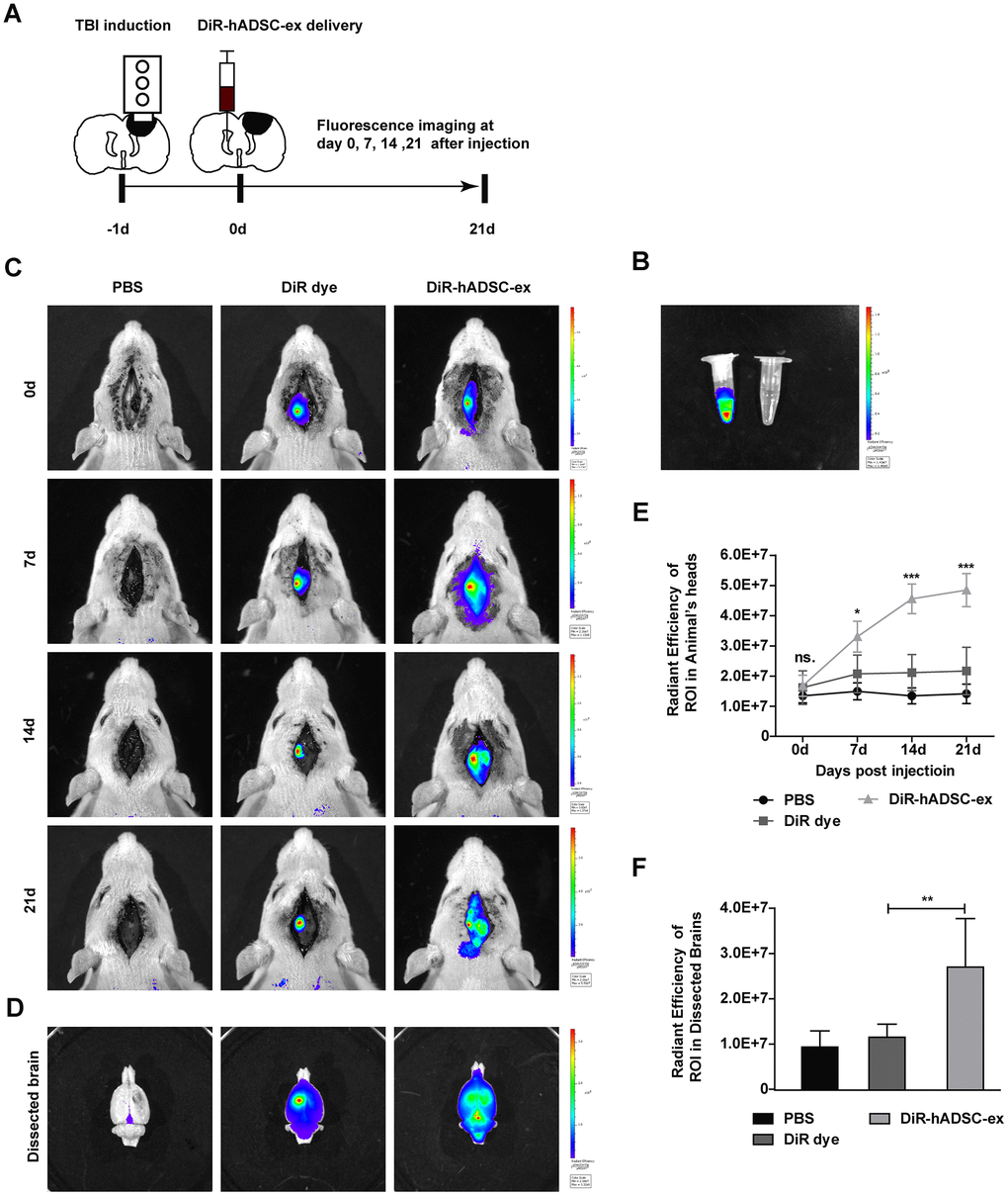 For in vivo tracking, hADSC-ex were stained with DiR dye (Invitrogen, D12731) according to the manufacturer's protocol. PBS, DiR dye or DiR-hADSC-ex were microinjected into the contralateral lateral ventricle 24 h after injury. The rats were anesthetized for observation under a Perkin Elmer (Caliper) IVIS Spectrum In Vivo System on days 0, 7, 14 and 21 after injection. Fluorescence images of DiR-hADSC-ex migration and biodistribution throughout the brain ventricle were acquired at an excitation wavelength of 740 nm and an emission wavelength of 790 nm, and were analyzed using Living Image® 4.5.5 software (Perkin Elmer).