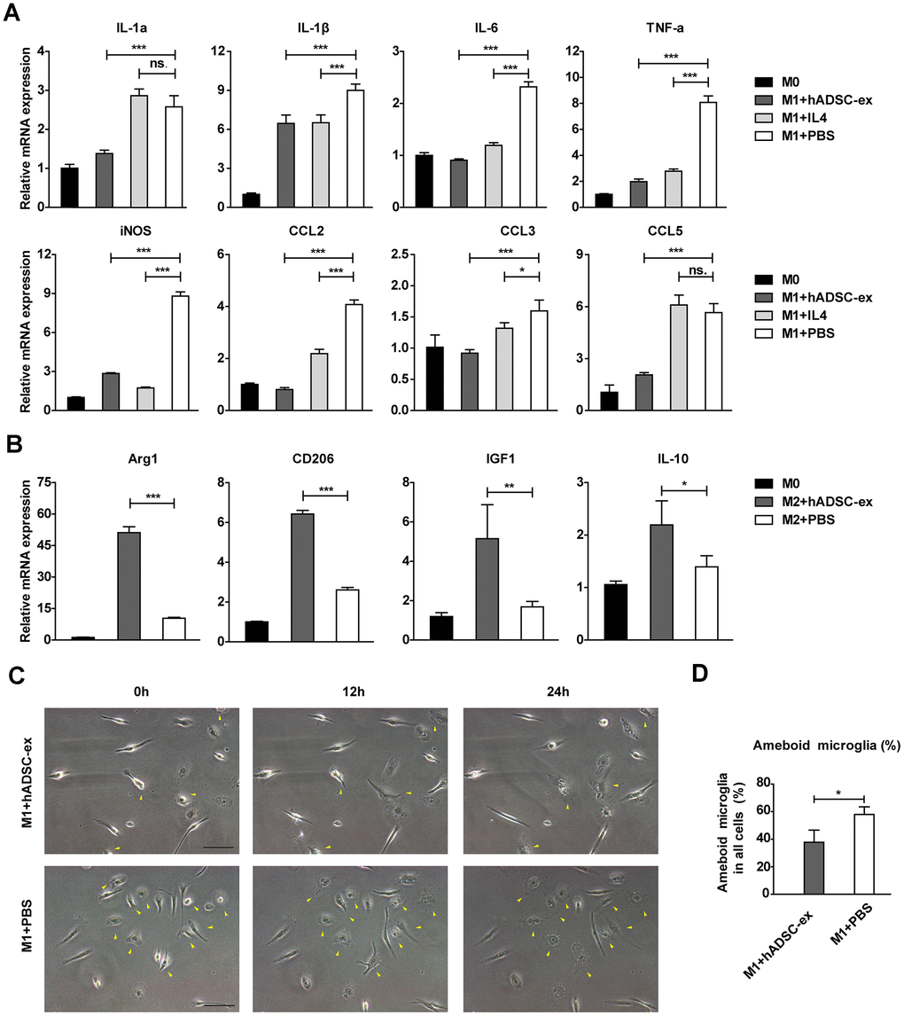 To assess the effects of hADSC-ex on the functional status of microglia, we isolated primary microglia from adult rat brains and induced them into different functional states (M0, M1 and M2 phenotypes) as described previously [25, 26]. Microglia were incubated with hADSC-ex during their induction from the M0 to the M1 phenotype. The mRNA levels of M1-associated factors (IL-1α, IL-1β, IL-6, TNF-α, inducible nitric oxide synthase [iNOS], chemokine ligand 2 [CCL2], CCL3 and CCL5) were analyzed using qRT-PCR, and the dynamic morphological changes in microglia were observed using time-lapse live cell imaging, as described previously [27, 28]. The hADSC-ex significantly inhibited the expression of M1-associated proinflammatory cytokines (Figure 5A) and the morphological transformation from the M0 to the M1 state (activated microglia with an amoebic appearance; Figure 5C, 5D). Furthermore, hADSC-ex promoted the mRNA expression of M2-associated cytokines (arginase 1, CD206, insulin-like growth factor 1 and IL-10) in the process of M0 to M2 induction (Figure 5B). Thus, hADSC-ex likely suppressed the microglial functional state change from M0 to M1 and promoted the transition from M0 to M2 in vitro.