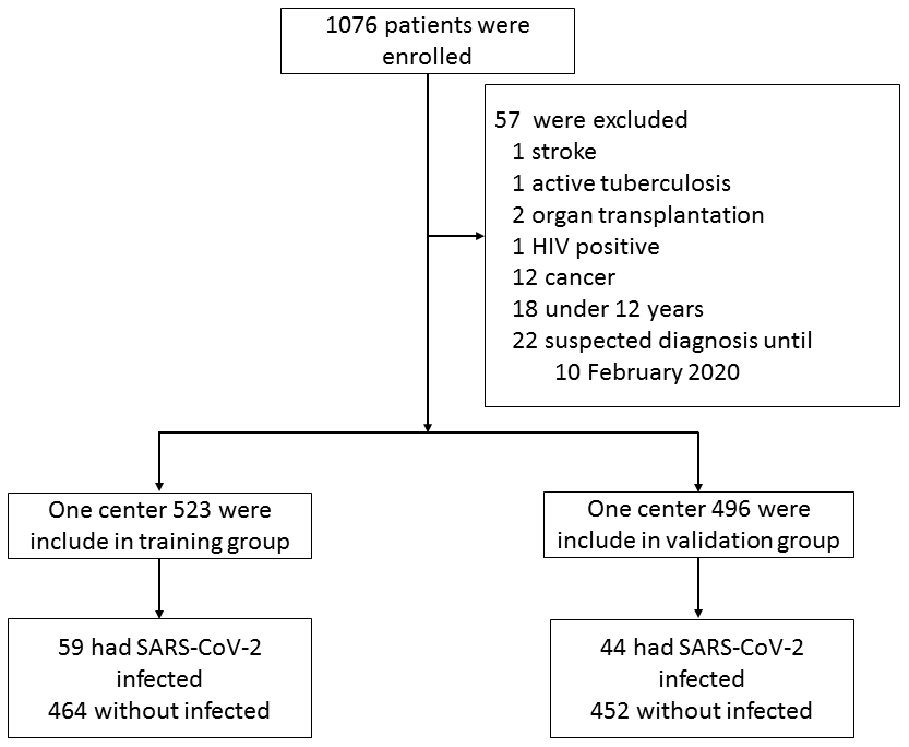 A total of 1019 patients were enrolled in this study out of the 1076 patients who presented to fever clinics until 5 February 2020. Fifty-seven patients were excluded, including one with stroke, two with organ transplantation, one with HIV, 12 with cancer, one with active tuberculosis, 18 with age < 12 years, and 22 unconfirmed cases until 10 February 2020 (Figure 1). Of the 1019 patients, 485 (48%) were female, and the median age was 34 years (range 13 to 91 years). The characteristics of the patients are shown in Table 1. All received sequencing or nucleic acid testing using RT- PCR; 103 (10.11%) tested positive for SAR-CoV-2 (Supplementary Table 1).