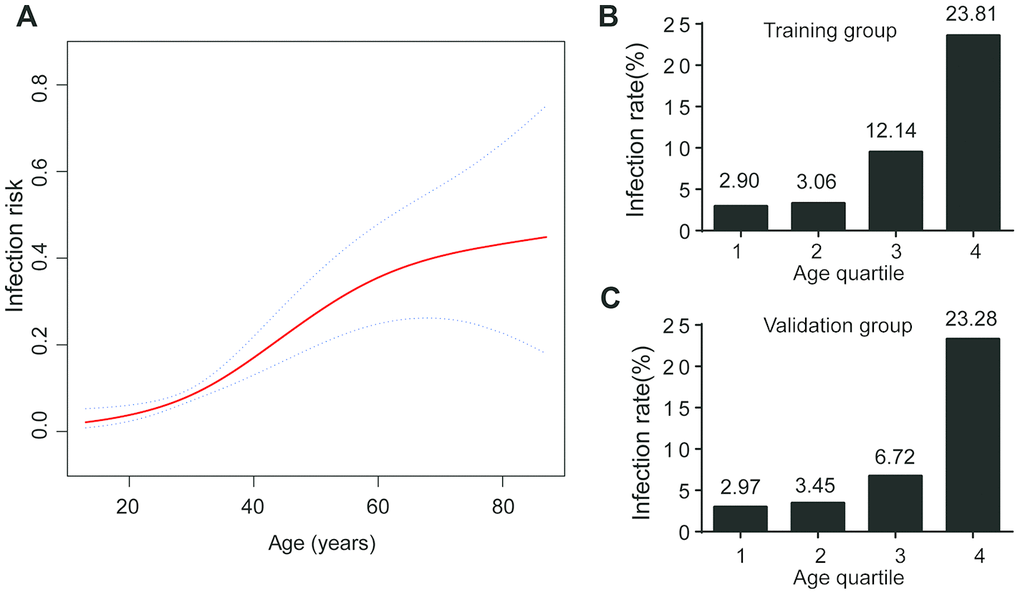 The association between age and infection rate is presented in Figure 2A. The rate of SARS-CoV-2 infection increased with age. After stratifying patients by age quartile, the positive rate of SARS-CoV-2 infection from first to fourth quartile was 2.90%, 3.06%, 12.14%, and 23.81% in the training group, and 2.97%, 3.45%, 6.72%, and 23.28% in the validation group (Figure 2B, C). The risk of infection in last two quartiles was relatively higher than the first two quartiles. The infection rate was lower (less than 5%) for patients with age < 32 years. Subgroup analyses were performed for patients with age ≥ 32 years to stratify those as high-risk population.