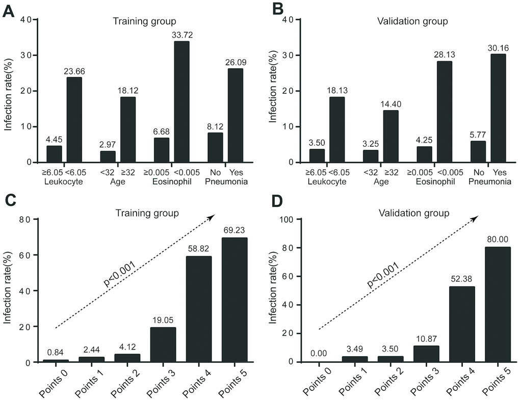 Significantly higher infection rate was observed in those with leukocytes < 6.05×109/L (23.66% vs 4.45% in leukocytes ≥ 6.05×109/L), and eosinophils < 0.005×109/L (33.72% vs 6.68% in eosinophils ≥ 0.005×109/L) in the training group. The trend was consistent in the validation group, where the infection rate was 18.13% vs 3.5% for leukocyte subgroups, and 28.13% vs 4.25% for eosinophil subgroups (Figure 3).