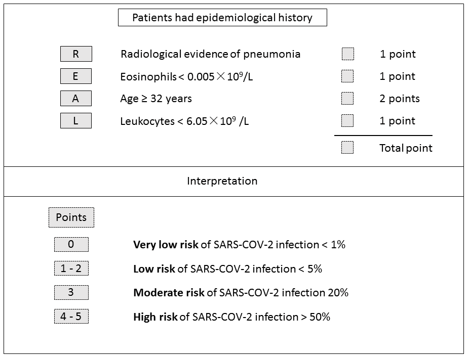 The advantage of present study is that a simple and applicable prediction model, COVID-19-REAL, which combines age, radiological image, and two functionally related hematological indicators (i.e., leukocytes and eosinophils) has been developed to stratify and distinguish between high- and low-risk populations suspected of SARS-CoV-2 infection. This evaluation of suspected cases based on age, radiological image, and two dichotomous criteria could be easily implemented in routine clinical practice. In clinical settings where resources and testing kits are limited, patients with advanced respiratory symptoms are usually tested first. However, those undiagnosed mild-type COVID-19 patients who were not properly isolated would become sources of infection as the viral load peaked near symptom presentation. This score system will be of great help for early infection screening and offer more information for physicians to help prioritize high-risk patients.