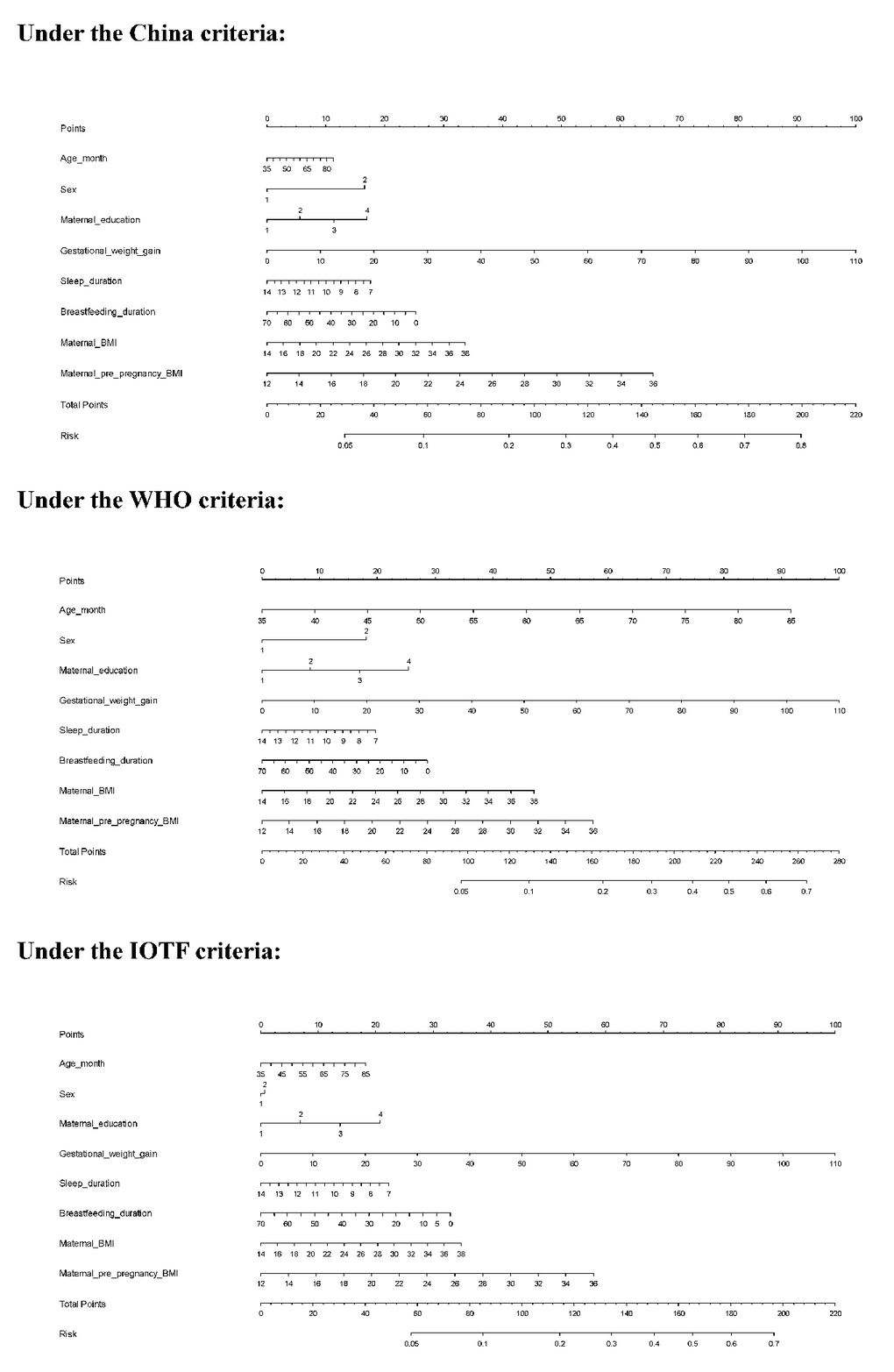 Taking the risk prediction nomogram model under the China criteria as an example: assuming a boy (17 points) aged 60 months (5 points), with maternal education of high school (12 points), GWG of 30 kg (28 points), sleeping duration of 11 hours (7.5 points), breastfeeding duration of 5 months (23 points), maternal BMI of 30 kg/m2 (22.5 points), and maternal pre–pregnancy BMI of 28 kg/m2 (44 points), the probability of childhood overweight and obesity was estimated to be 64%.