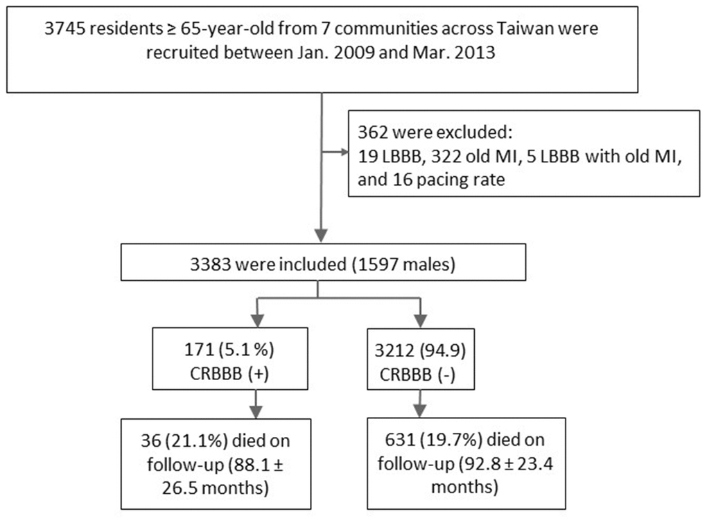 The Healthy Aging Longitudinal Study in Taiwan (HALST) is a prospective long-term community-based study of more than 5,800 adults that began in December 2008. It was designed to thoroughly examine the determinants of late-life health in an Asian population in Taiwan with long-term follow-up. The aim of the present study was to investigate the prevalence of CRBBB in the general population ≥65 years of age (which we define here as “elderly”), and to establish the prognostic implications of incidentally found CRBBB.