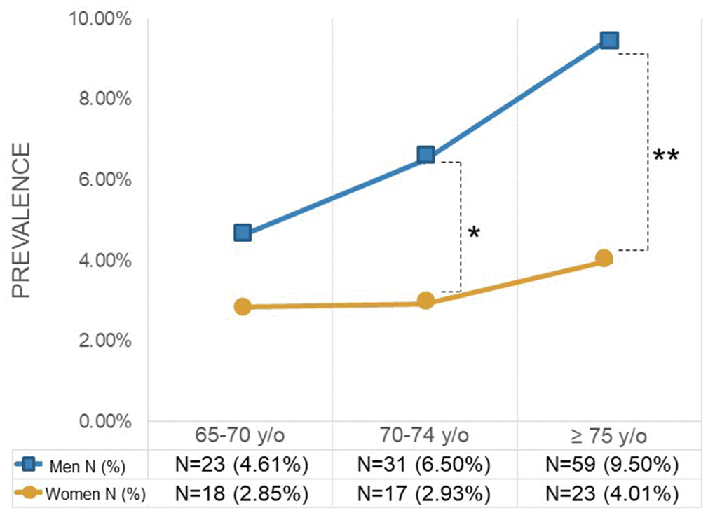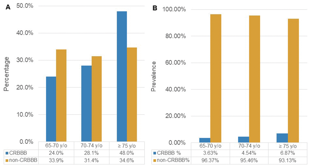 Figure 2A illustrates the age distribution among patients with and without CRBBB, showing that the group with CRBBB had a much higher percentage of people over 75. Figure 2B illustrates the prevalence of CRBBB in various age groups, showing that it significantly increased with age (P<0.001). On the other hand, the prevalence of CRBBB in elderly men was higher than that in elderly women regardless of age in this study (Figure 3). In additional subgroup analyses, we found that men older than 70 had significantly more CRBBB than women older than 70, whereas the difference was not significant below age 70 (P=0.0055 in 70-74 group, P=0.0002 in ≥75 group).
